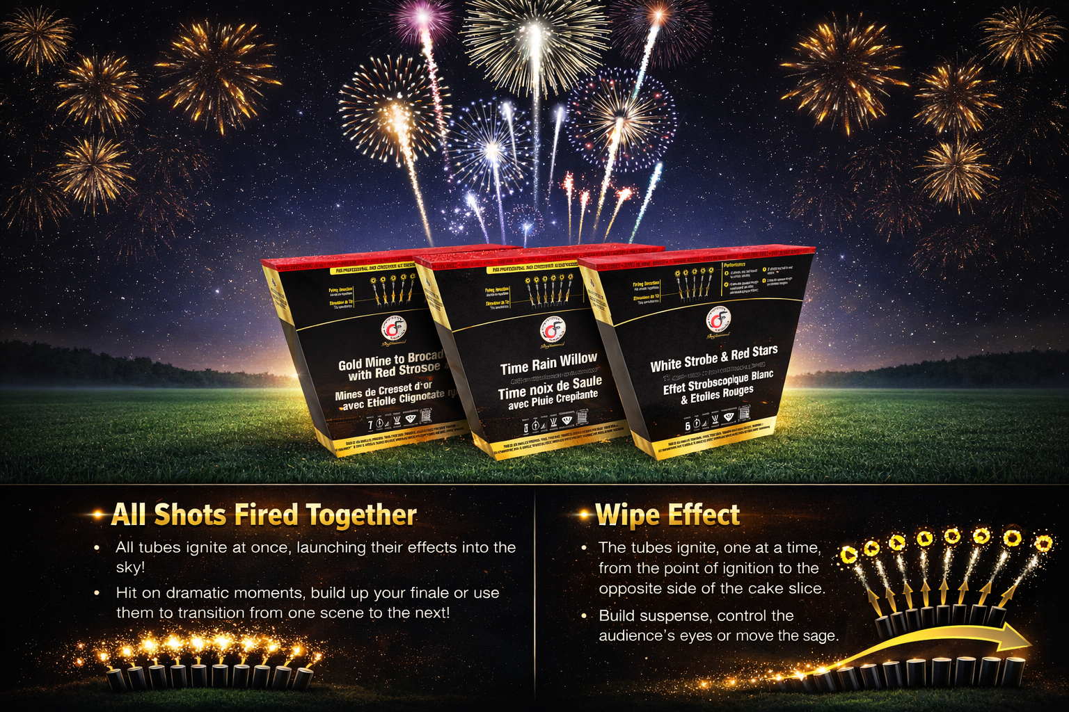 Introducing Cake Slices — a pro-fireworks secret now available to everyone! One powerful row of shots designed to add a burst of colour and punch right where you want it. Available in 3-7 shot slices, with effects from all-at-once blasts to sweeping wipe effects. Small slice. Massive impact..