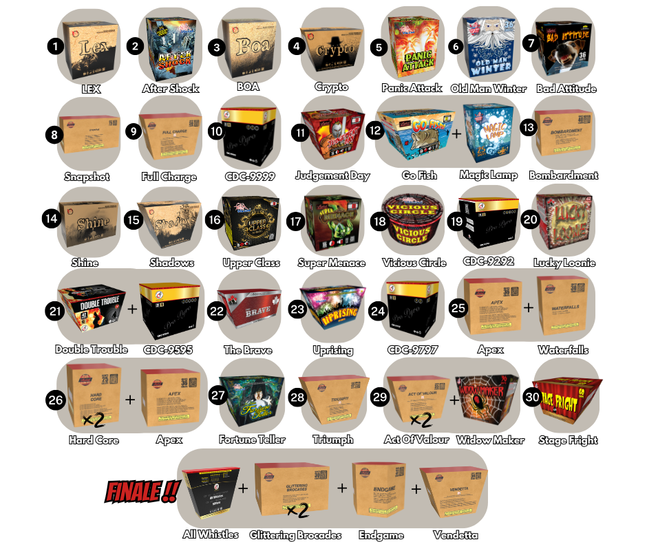 The Rock is our largest assortment kit, built for those who want it all. Featuring 42 cakes and an impressive 1,530 total shots, this powerhouse pack delivers nonstop action, variety, and maximum impact from start to finish. A true centerpiece kit designed to dominate the night and leave a lasting impression.